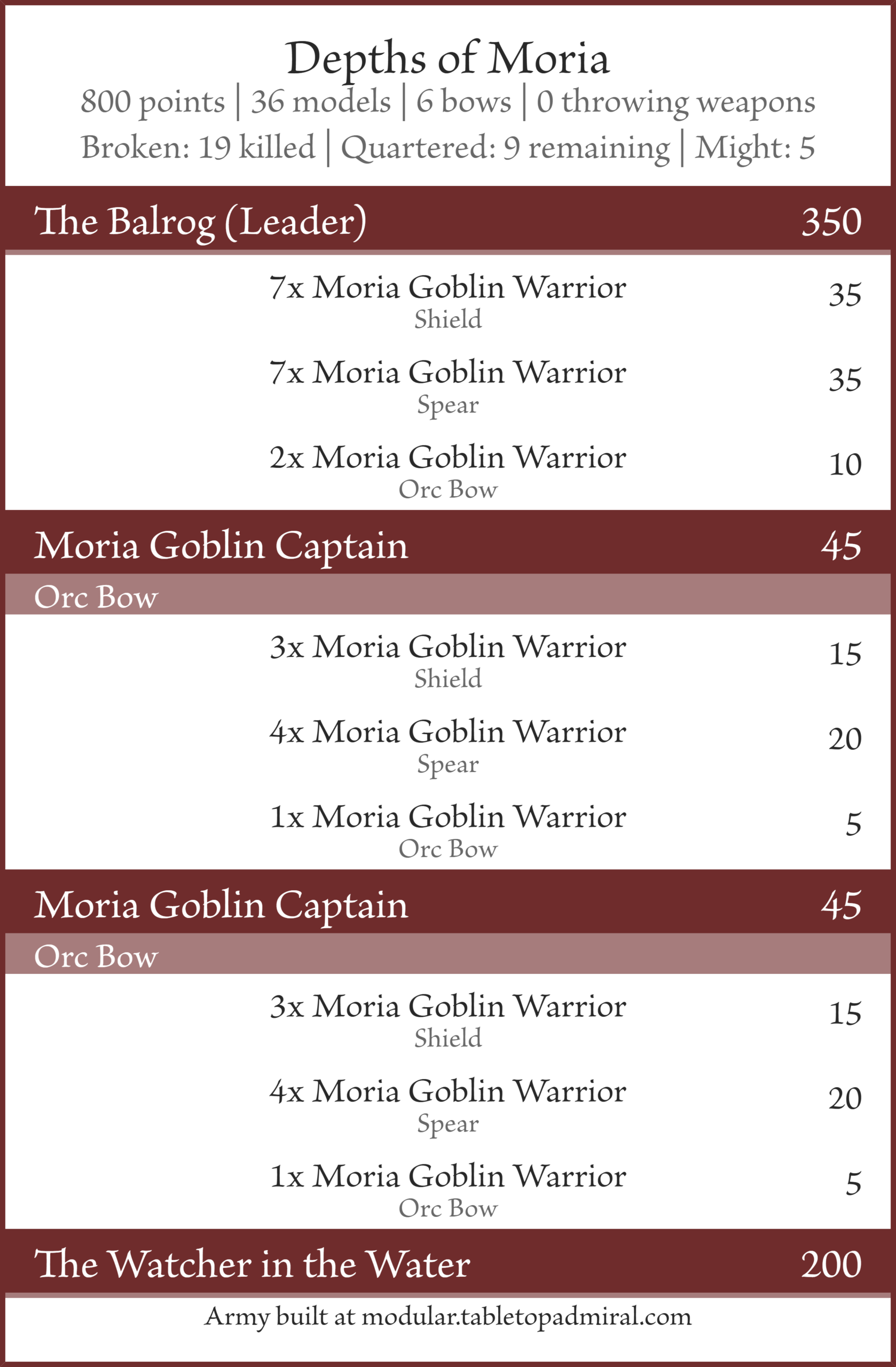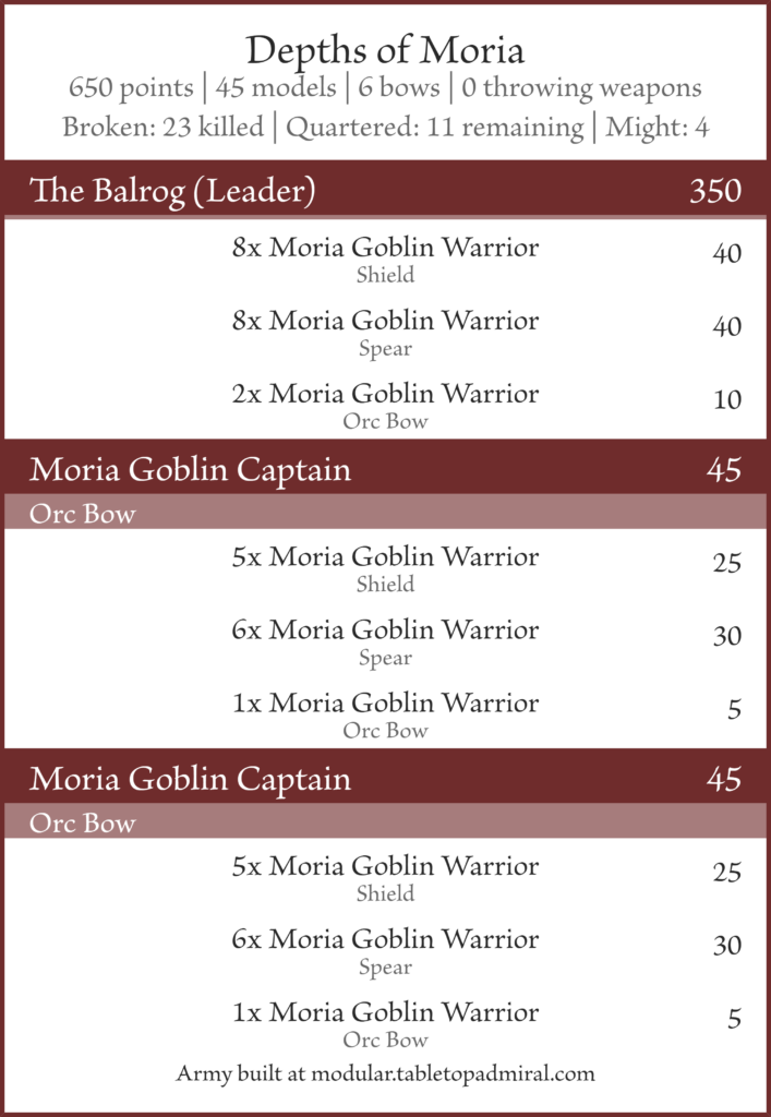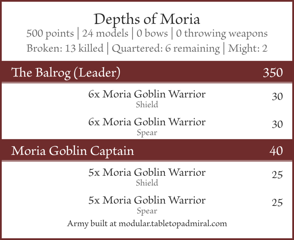 Oh yeah, the black shield captain and Moria goblin shaman also can’t be taken. They both felt kind of pointless in this army list anyway. On second thought, now that the Balrog’s Goblin mastery is reduced to 6″ the Moria goblin shaman might have had a place in Depths of Moria, oh well.