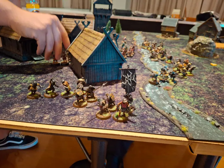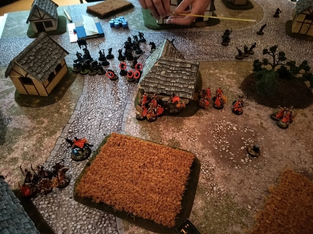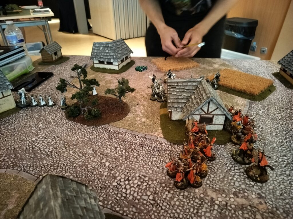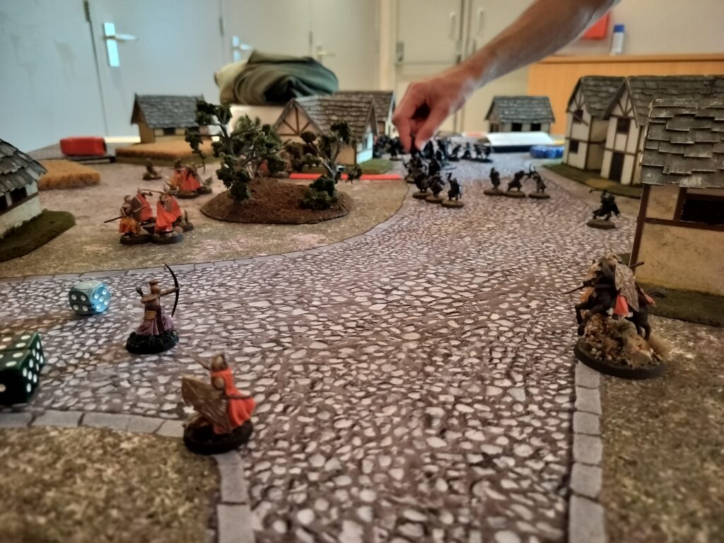A few turns before the main army got there, Elrond and Arwen were already busy using the central building as a hiding point while they threw out Bruinens to slow the enemies advance. This helped as my opponent was reluctant to charge through the gap. It also did not help that I won literally EVERY prio of the game. Seriously when does this happen? Sure I had five foresight points to spent, but still, Sjoerd’s priority rolls were absolute garbage. He also lost two heroic move roll-offs which were quite important.