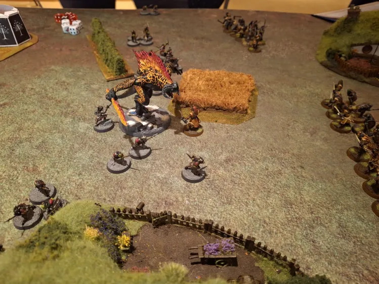 I still had some tricks up my sleeve, which mainly consisted of a hobbit with a very special ring. I figured that if I could just get the lines to clash, I could sneak past a couple of models and get my objective. This worked wonders as he also wanted to contain me on one point and sent most of his force towards a chokepoint were the lines would inevitably clash. I tried to move back and forth with my wrath which did the absolute bare minimum. To be fair, I wasn’t expecting it to do much, I just wanted to put pressure on him and offer some incentive to draw him out a bit. This did not work and the kills I got from it were negligible.