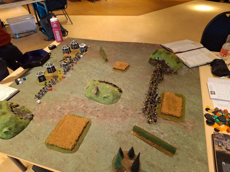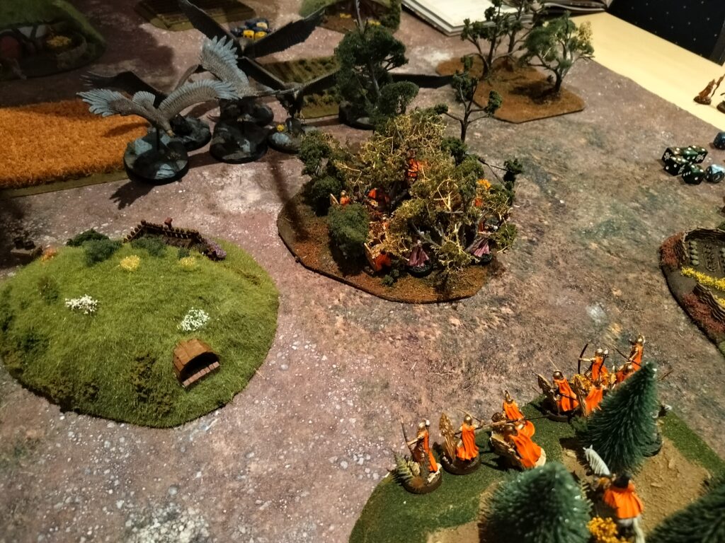 What did I just say, I wanted to face no more flappy birds. That’s what I get for hoping too much I guess. Anyway, it is To the Death and I have a banner whereas my opponent has none. I will just need to bide my time and not lose too many models, so at least it’s not a straight auto-loss because of the scenario. The board that we are playing on also leans a lot into that, I actually get a lot of forest! So there’s my win-condition right there, camp in the forest like a scumbag. I feel like it’s justified against The Eagles though, so I have no bad consience whatsoever.