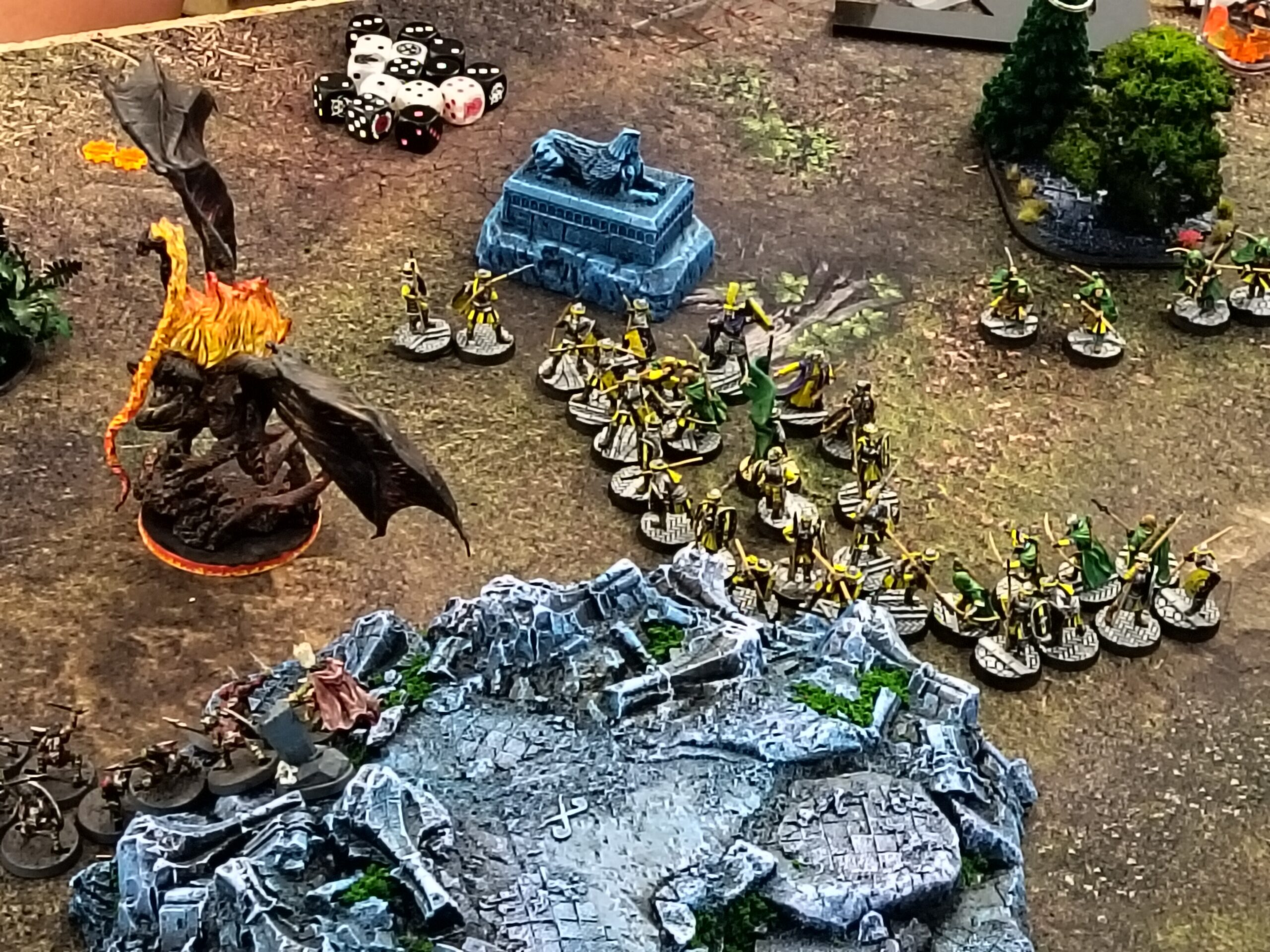 The first few turns we were dancing around each other a bit until Patrick finally saw an opening and charged a Mumak into the Balrog. This opening came in the form of a heroic march while I had just moved my captain out of 6″ from the Balrog. Expertly spotted from Patrick and a real beginner mistake from me. I was even actively thinking about this play, but somehow forgot a few turns later. Oh well, the charge managed to take 2 wounds from the Balrog and left him in combat. The Balrog promptly slapped back 2 wounds onto the Mumak to make it even. The Mumak was so surprised by this backhand that it immediately stampeded. Patrick rolled a snake eyes and was helpless to do anything about it. This was the “normal” Mumak, the other Mumak with his war leader was further towards his board side.