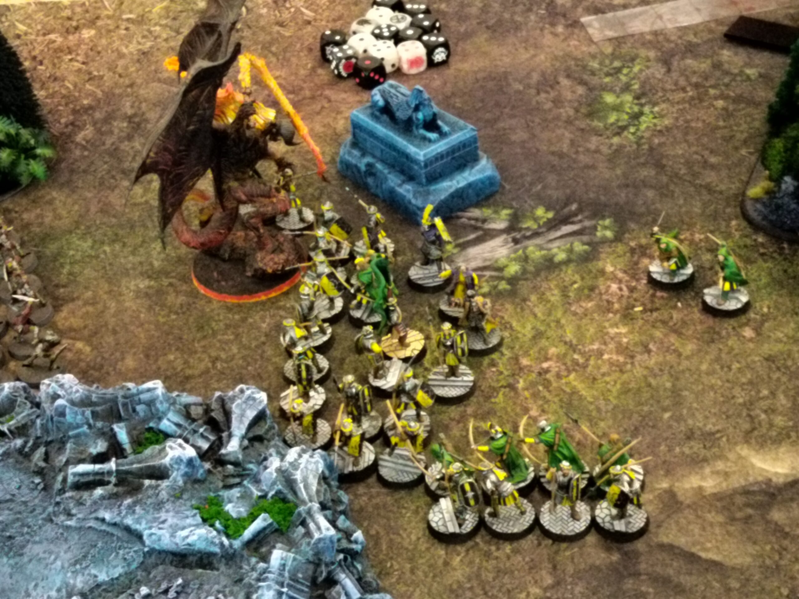 As the Balrog charged over the rock, Arnor ebbed away from him. I had one chance to decide the game then and there. Pjot had left his captain a bit exposed and I could whip him without any in the ways, so naturally, the Balrog missed. Had this whip gone of and had I killed the captain because of it, I could have just sat back and played defensive. Oh well, the game was by no means decided yet. The Balrog made up for it by rolling 6’s in the next 3 turns of combat. He wasn’t converting a lot of kills though, but that was mainly because of the super fun and interactive +5 Malbeth save.