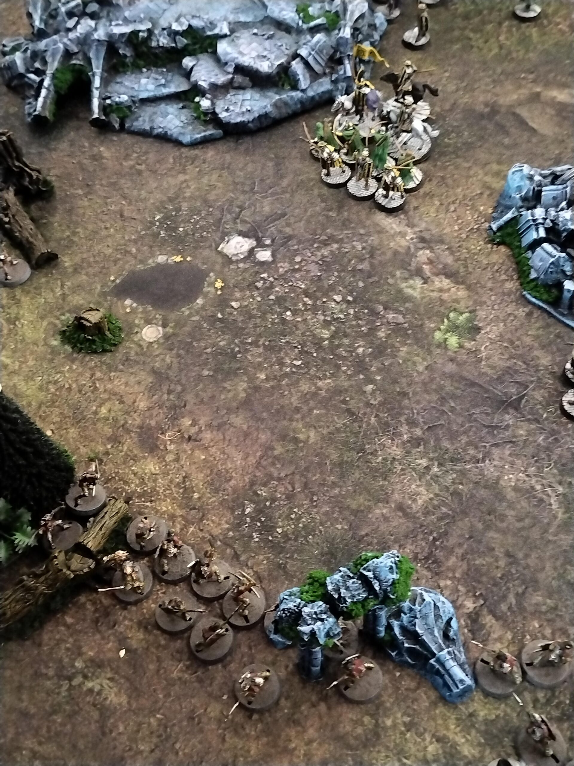 The game started off with some very standard deployment. Basically a big line with our most important pieces in the middle. The first few turns went as expected. Pjot did some kills with shooting while I threw my army forwards. I did keep 2 captains and about 12 goblins back to defend my terrain pieces. Over the course of the game Pjot played it very well, keeping his objective hidden by moving erratically. Only in the last turn I discovered what his objective was. My own objective was the woods on the far left. I figured that sneaking goblins past such a wide and competent battle-line was folly and went for an objective that I could threaten well with the Balrog. The passable hill in front of my chosen piece of terrain led to this decision. It meant I could walk up with cover, leading most of his shots towards the goblins which were kept back. I wanted to arrive with the most sizable force possible to support the Balrog. Because let’s be frank, the goblins were not gonna do it vs Arnor.