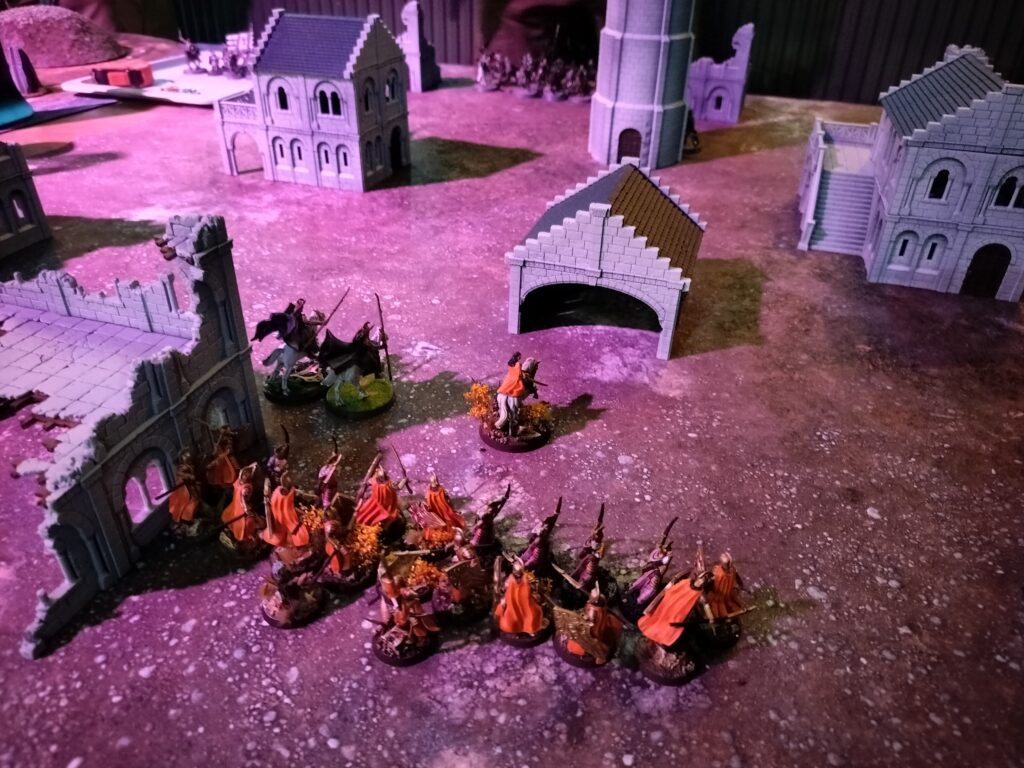 Man oh man, was I scared going into this. The first round of the game was Recon, one of my most hated scenario’s, and I was going up against a fully mounted army list! Much kudo’s to Dani for bringing this list in particular though since it was something different. Boromir brought 18 mounted Minas Tirith knights, who got +1 to wound on the charge and +1 to wounds once per game when Boromir called “For Gondor!”, yikes. Furthermore, I just did not see me winning this game as I could not prevent the knights from simply charging around my army. Knowing this, I just marched straight up the middle and said: “I have 24 models, you have 18. If you ignore me and we both get of the board I will just win.” This worked and my opponent brought his army together again to prepare for the charge. I could leverage the terrain on the board to my advantage and found a nice chokehold to prevent him from sneaking models through.
