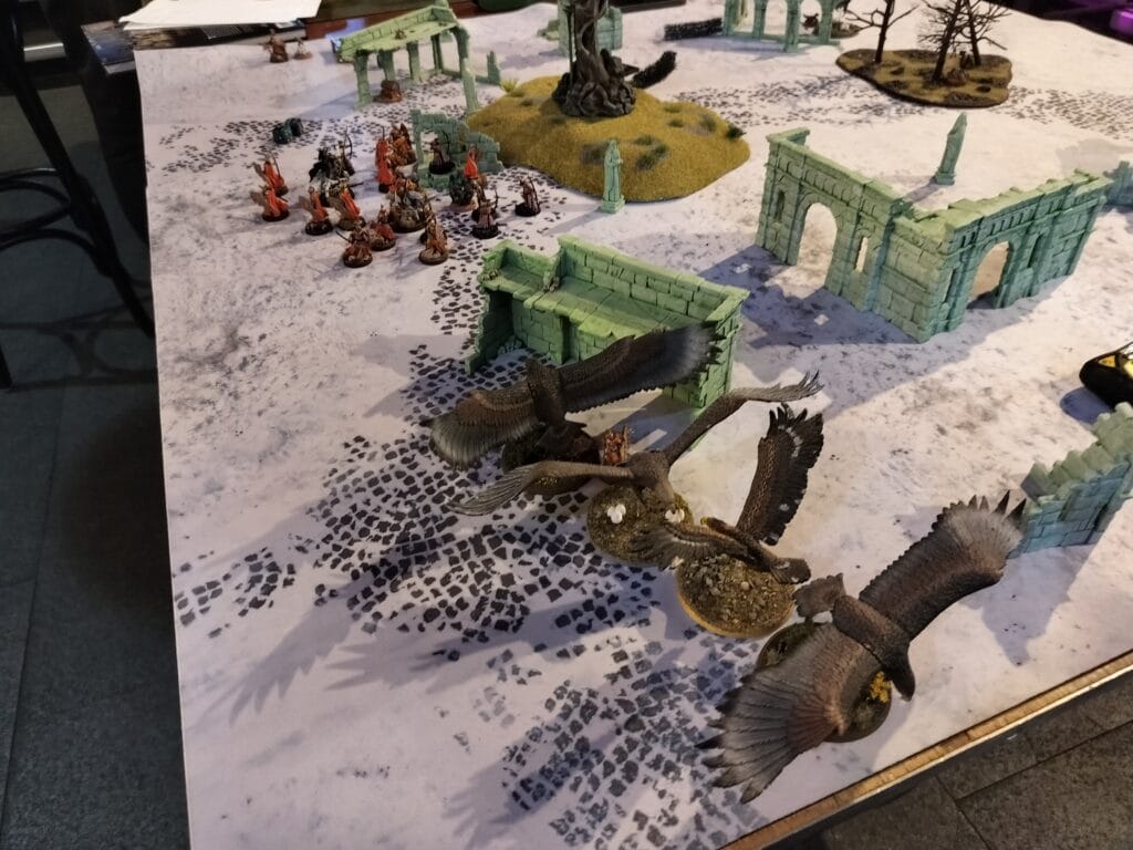 The luck I was riding by this tournament didn’t last for the 3rd game, I would have to face the dreaded eagles. Destroy the supplies is my favorite scenario and I have a banner, so I thought it might not be so bad playing eagles in this one. Then I realized that I had to defend 3 spread out objectives with 24 models against 5 12″ flying monsters who don’t die. My opponent didn’t make it any easier. I have played against Sjoerd before and I know him to be a skilled player, and our previous game was great so I’m hoping this one will be too.