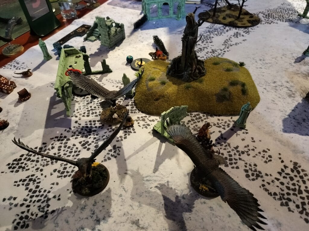 I did have one thing going for me this game, and that is woodland terrain. There were two big forest pieces in the center of both our deployment zones. It was a shame that my central objective was just outside of it, but I take all I can get this game. This is probably the only thing which made it an actual game instead of Sjoerd just rolling over me with his eagles. I deployed in the middle and my opponent did the same. The following turns went as expected, he danced around me waiting for a turn were he could move second and pounce. This went on for quite a while because I kept rolling high on my prio rolls. Meanwhile, I was doing all I could with shooting but only managed to get a single wound of a fledgeling in around 8 turns, pretty piss poor. To be fair, my opponent was doing all he could to keep the D7 fledgelings behind terrain or an eagle, but still, not too great.