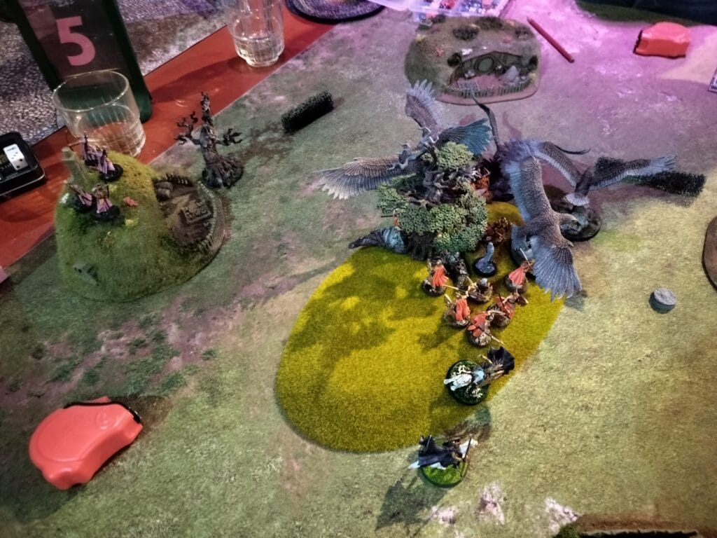After he took my right flank objective he moved all the way to the left flank going the long way around with his eagles. This was to group up with the eagle which had been sent to deal with the lone Rivendell knight. I was fine with this. My whole tactic relied on stalling the game as much as possible and win on banner VP’s. I always knew the Rivendell knight would die and probably would not get the objective, but it was worth it to stall him for essentially 3 more turns.