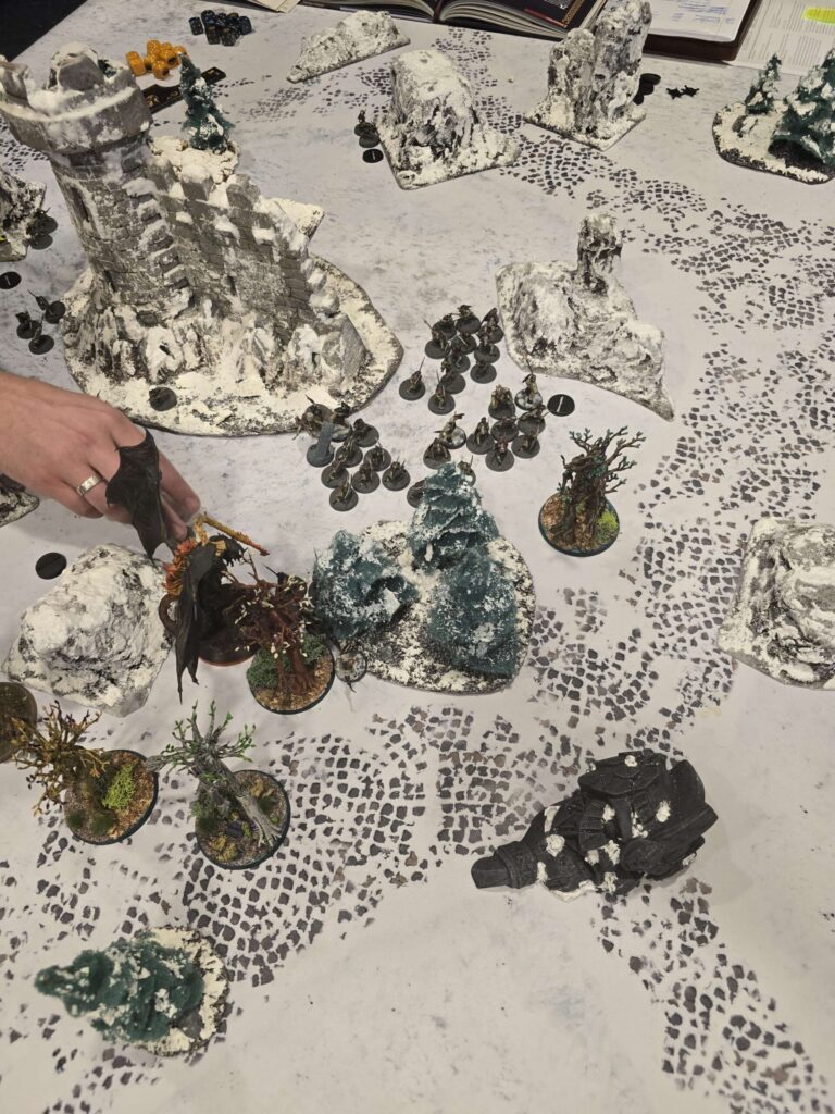 He deployed in the back of the board to avoid the Balrog’s whip and get some shooting in. However, after seeing how far the Balrog could move up and whip he opted to move with half his army deployed on his right flank, towards his left flank. This did leave him with no shooting, but I understand the move. Eventually he could not get around the Balrog being in whip range. He still moved up with his ents to try and get them together on his left flank to potentially start stomping on goblins and maybe get to my back objective. The next turn, there was a Balrog in the way though. True to his nature he missed his whip in both turns, but this did not change the outcome of the game too much.