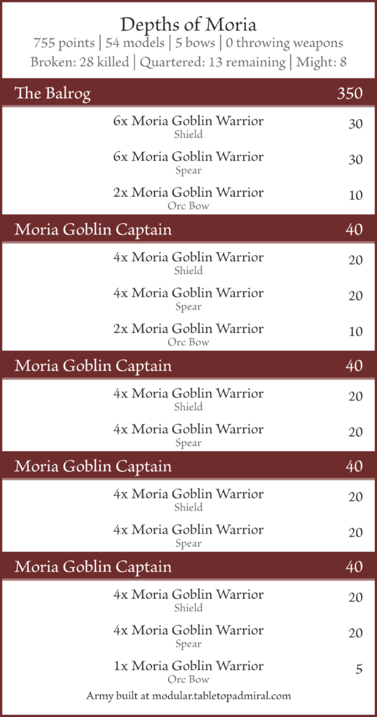 I would have loved to see how Rivendell held up at 759, but I simply don’t have the models yet and certainly not the time to paint them all. So I would have to play the only other army currently available to me, Depths of Moria. I’m not complaining, this army is definitely not weak, though I don’t think it is as strong as some people claim it to be. I just hope that GW drops the Armies of Middle-Earth book so I can play something else before I grow tired of the Balrog. It’s an army that I have a lot of experience with as well, since Moria is the first army that I painted. I played it a lot in the previous edition and it was certainly a force to be reckoned with in some scenario’s. 759 Is also not an ideal point level for the list. I feel like you can start putting the watcher down at and above 800, and you’re already putting sufficient models down at 600-650. At 750 your opponent usually has more tools to counter the Balrog and the extra 12 goblins and a captain just don’t provide the same value as some lists can bring.